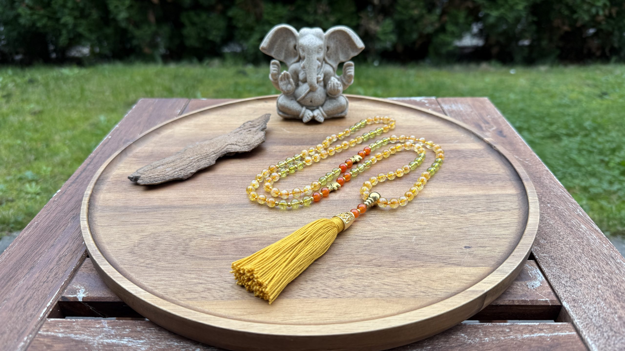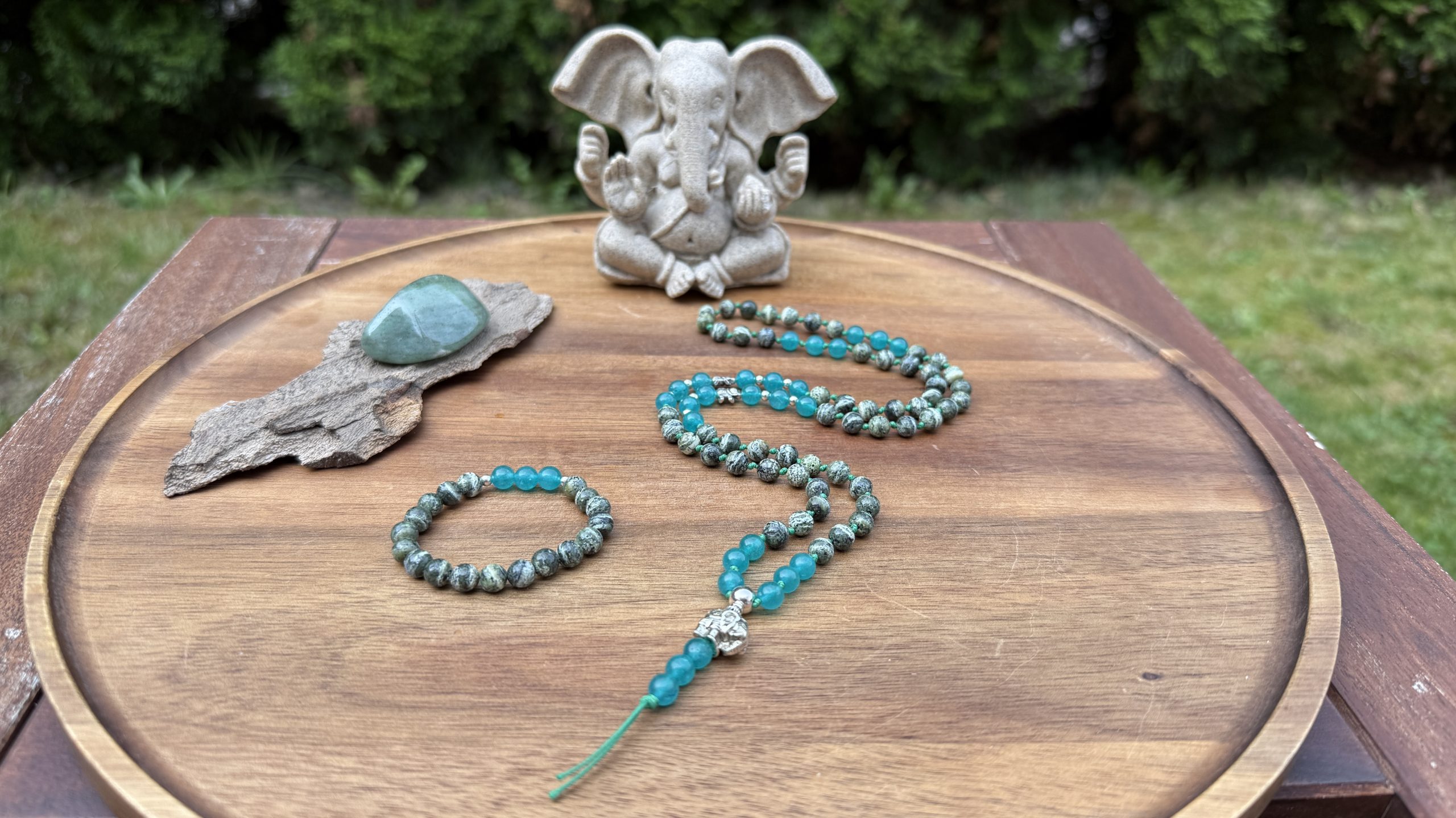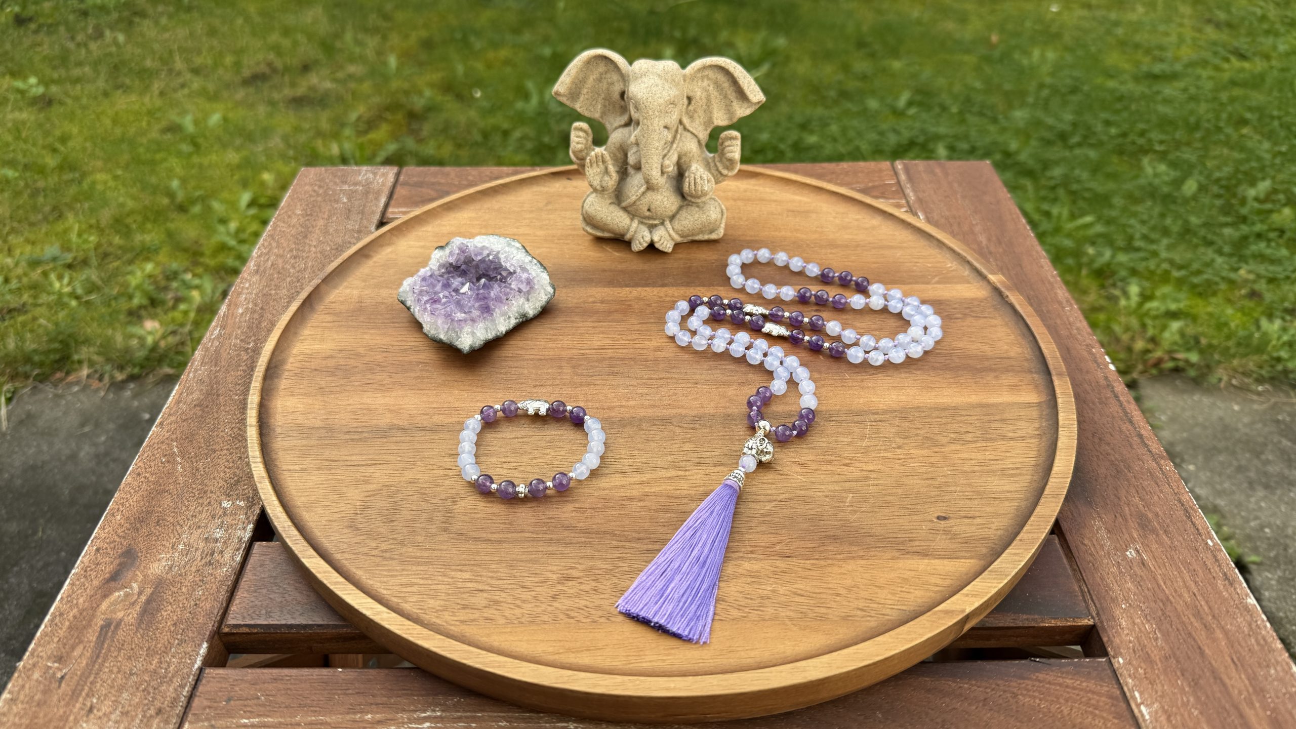 Eine Mala ist eine Gebetskette, die häufig in östlichen Religionen verwendet wird, um die Rezitationen von heiligen Klängen oder Beschwörungen zu zählen, und ich stelle sie schon seit einiger Zeit her. Viel mehr als nur ein schönes Schmuckstück ist eine Mala auch ein kraftvolles und symbolisches Werkzeug, um die Meditation zu vertiefen und zu intensivieren. Es wird gesagt, dass jeder Edelstein unterschiedliche Eigenschaften, Energien und Bedeutungen hat. Wenn du ihre Energie mit deinen Gebeten, Hoffnungen und Träumen verbindest, wird die Mala letztendlich zu dem, was der Träger von ihr erwartet.